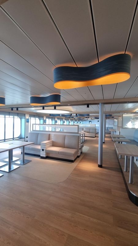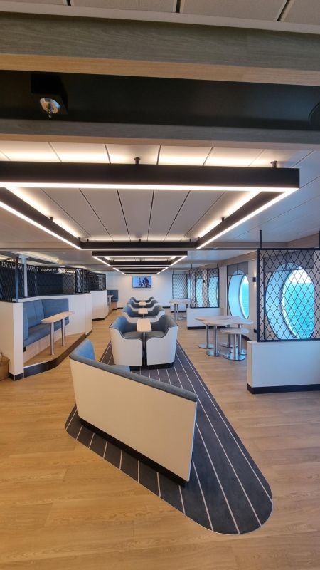Nowy Green Ship oferuje nastrojową i przytulną atmosferę z naturalnymi kolorami i przemyślaną koncepcją oświetlenia. Skandynawski klimat był główną inspiracją przy projektowaniu wnętrz najbardziej ekologicznego promu w historii firmy. Na pokładzie Zielonego Statku dostępnych jest łącznie 239 nowoczesnych, przestronnych i wygodnych kabin w różnych kategoriach. Dla rodziców z dziećmi przeprawa Zielonym Statkiem będzie prawdziwą przygodą. Przestronny plac zabaw oferuje maluchom dużo miejsca do zabawy i szaleństwa, podczas, gdy rodzice mogą odpocząć i cieszyć się podróżą tuż obok.