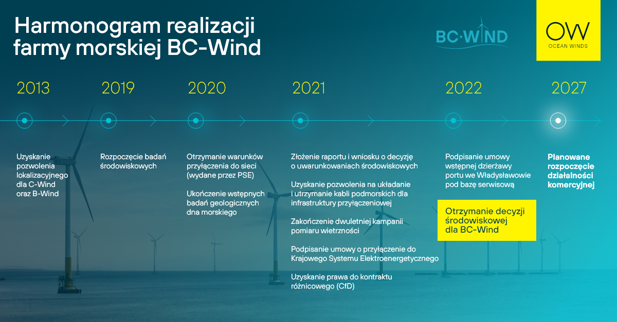 Morska farma BC-Wind jest realizowana zgodnie z harmonogramem. W 2013 roku zostało wydane pozwolenie lokalizacyjne dla C-Wind oraz B-Wind (tzw. pozwolenia na wznoszenie i wykorzystywanie sztucznych wysp, konstrukcji i urządzeń dla morskich farm wiatrowych), a w 2019 r. uruchomiono badania środowiskowe (niezbędne do przeprowadzenia oceny oddziaływania inwestycji na środowisko naturalne). Rok później zakończono wstępne badania geologiczne dna morskiego i Spółka otrzymała warunki przyłączenia do sieci (wydane przez Polskie Sieci Elektroenergetyczne). W 2021 r. złożono raport i wniosek o wydanie decyzji o środowiskowych uwarunkowaniach i uzyskano pozwolenie na układanie i utrzymanie kabli podmorskich dla infrastruktury przyłączeniowej. Ważnym etapem inwestycji było zakończenie dwuletniej kampanii pomiaru wietrzności i podpisanie umowy o przyłączeniu do Krajowego Systemu Elektroenergetycznego, jak również uzyskanie prawa do kontraktu różnicowego (tzw. CfD). W maju bieżącego roku została podpisana umowa wstępna dzierżawy portu we Władysławowie pod bazę serwisową dla morskiej farmy wiatrowej BC-Wind.
