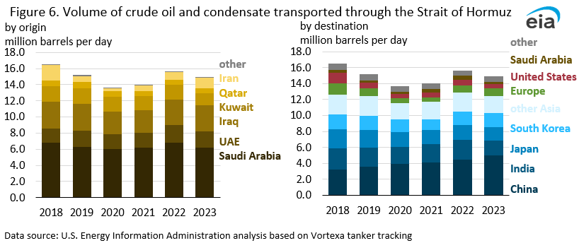 EIA szacuje, że w 2024 r. 84% ropy naftowej i kondensatu oraz 83% skroplonego gazu ziemnego, które przemieszczały się przez Cieśninę Ormuz trafiło na rynki azjatyckie. Głównymi odbiorcami były Chiny, Indie, Japonia i Korea Południowa. Przez Cieśninę Ormuz do Azji docierało w ubr. łącznie 69% wszystkich dostaw morskich ropy naftowej i kondensatu poprzez Ormuz. Rynki te prawdopodobnie najbardziej ucierpiałyby z powodu zakłóceń w dostawach z Zatoki Perskiej.