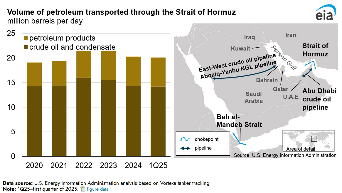 Ormuz, to cieśnina przez która mogą przechodzić największe zbiornikowce z ropą naftową, a także zbiornikowce LNG. Dziś jest jednym z najważniejszych i najbardziej newralgicznych na świecie wąskich gardeł ropy morskich dostaw naftowej. W 2024 r. przepływ ropy przez cieśninę wynosił średnio 20 milionów baryłek dziennie (b/d), co odpowiada około 20% światowego popytu na ten surowiec. W pierwszym kwartale 2025 r. transport ropy przez Cieśninę Ormuz był podobnej wielkości co rok wcześniej.