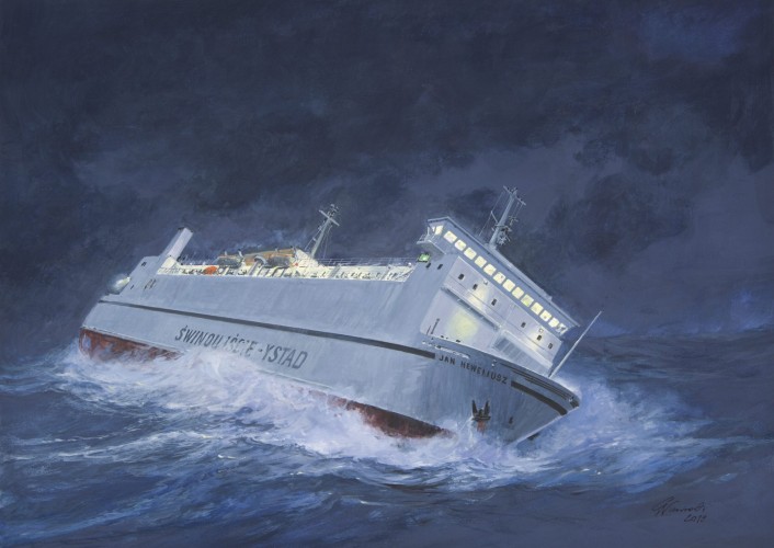 Około godziny 4:00 huraganowy wiatr uderzył w bok statku, powodując gwałtowny przechył. Kapitan Andrzej Ułasiewicz próbował ustawić dziób promu pod wiatr, ale podmuchy były zbyt silne. Jednostka chwiała się coraz bardziej, a ładunek – ciężarówki i wagony – zaczął się przesuwać, zrywając mocowania. Równocześnie na pokład samochodowy zaczęła wdzierać się woda przez nieszczelną bramę rufową.