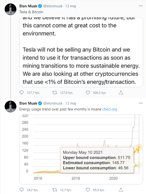 13 kwietnia 2021 roku Elon Musk opublikował oświadczenie na łamach Twittera, że Tesla zawiesza możliwość zakupu samochodów elektrycznych za pomocą Bitcoina. Władze firmy zaczęły mieć wątpliwości w związku ze zwiększającym się zużyciem paliw kopalnych (w szczególności węgla) do produkcji energii elektrycznej napędzającej tzw. kopalnie kryptowalut. W oświadczeni podkreślono, że kryptowaluty są świetnym pomysłem, ale nie powinno się ich używać kosztem środowiska.