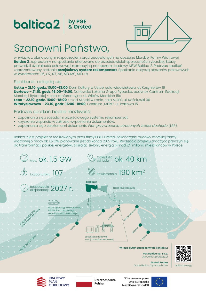 W dniach 21-23 października w miastach portowych Ustka, Łeba, Władysławowo oraz Darłowo odbędą się spotkania. Ich celem będzie zaprezentowanie tymczasowego mechanizmu rekompensat opracowanego w ramach dokumentu Plan Przywracania Utraconych Źródeł Dochodów (Livelihood Restoration Plan- LRP). System rekompensat ma zapewnić wsparcie finansowe lokalnej społeczności rybackiej, której działalność zostanie dotknięta budową infrastruktury wiatrowej w wyznaczonych obszarach morskich. Dokument LRP powstał z uwzględnieniem informacji i sugestii pozyskanych podczas wcześniejszych konsultacji z przedstawicielami lokalnej społeczności rybackiej. Zapisy dotyczące tymczasowego mechanizmu rekompensat dla części offshore odzwierciedlają wnioski wynikające z tych konsultacji.