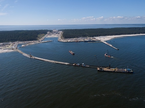 Intensywne roboty odbywają się też w Zatoce Gdańskiej. Trwa pogrążania ścianek szczelnych, zasypywanie grodzy oraz układanie narzutów z kamienia łamanego w części zasadniczej falochronu wschodniego i zachodniego. Na bieżąco odbywają się dostawy betonowych elementów typu Xblock, X-block plus, które są układane na falochronie wschodnim.
