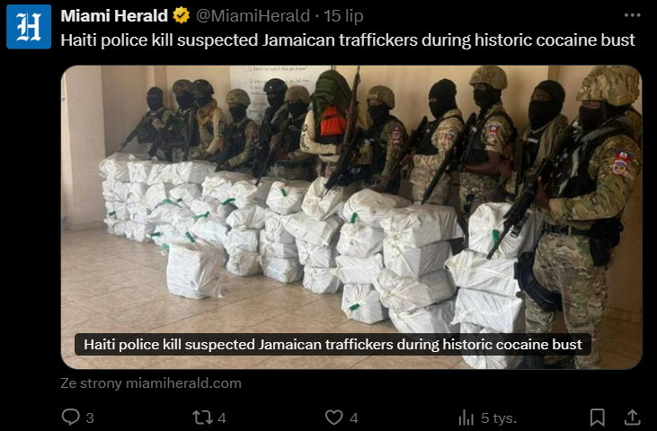 Trzech podejrzanych zginęło w wymianie ognia z haitańską policją podczas akcji, w której funkcjonariusze przejęli ponad tonę kokainy przewożonej łodzią — podała we wtorek agencja AP, podkreślając, że w ogarniętym chaosem kraju rzadko dochodzi do takich konfiskat.