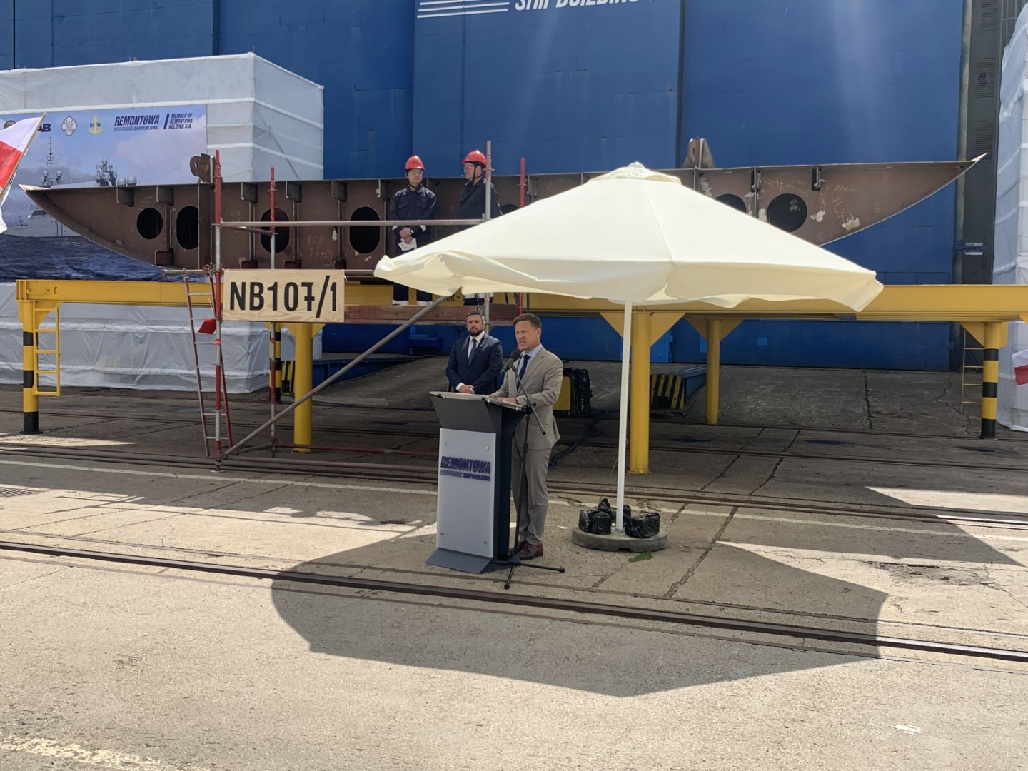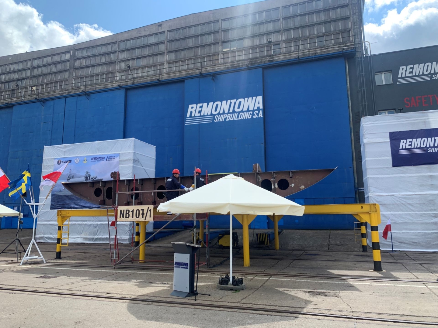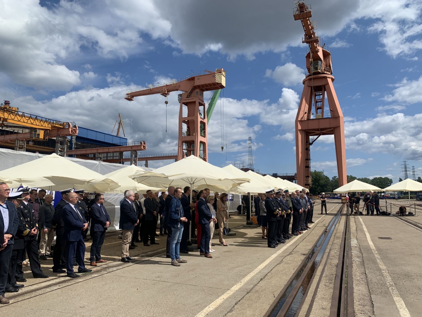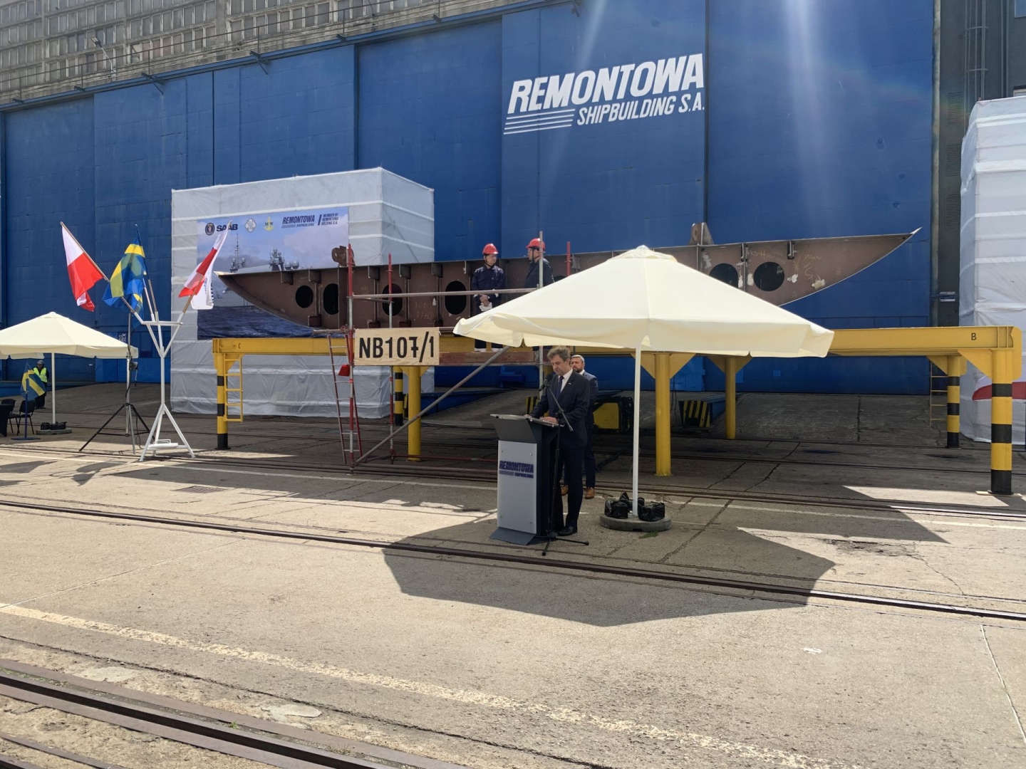 Ledwie dwa dni temu taka sama uroczystość w tym samym miejscu była poświęcona niszczycielowi min proj. 258, przyszłemu ORP Jaskółka, który wejdzie w skład 12. Dywizjonu Trałowców 8. Flotylli Obrony Wybrzeża. Dziś można było zobaczyć, jak prezentuje się element okrętu, który jako pierwszy, z zaplanowanych dwóch, wejdzie w skład Grupy Okrętów Rozpoznawczych 3. Flotylli Okrętów.