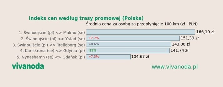 Przyglądając się całemu rynkowi Vivanoda zauważyła, że przeprawy promowe do Turcji, Wielkiej Brytanii, Islandii i Maroka mają najwyższy wskaźnik cen. Co ciekawe analiza wskazała, że im podróż jest krótsza tym jej cena jest większa. Najtańsze oprócz Polski są przeprawy na Łotwę, do Tunezji, na Litwę, do Szwecji i Finlandii. Największy wzrost cen promów w porównaniu z rokiem 2023 odnotowały: Cypr, Islandia, Litwa, Niemcy i Norwegia. Połączenia między Niemcami a Litwą lub Łotwą są najmniej kosztowne w stosunku do przebytej odległości.