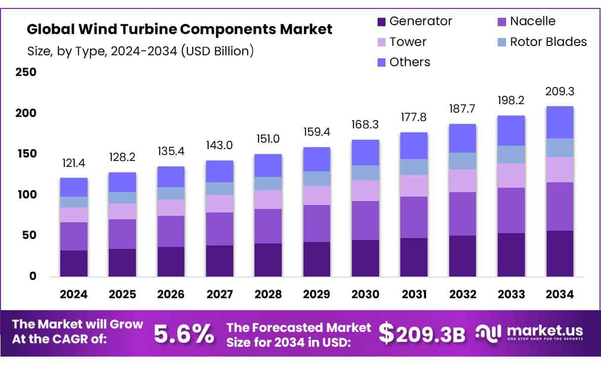 Wartość światowego rynku energii wiatrowej w 2023 r. szacowano była na 89,60 mld USD. W 2024 r. wartość ta wzrosła do 98,74 mld USD. Przewiduje się, że w 2034 r. ma osiągnąć zbliżyć się do około 260,81 mld USD. Taką wartość osiągnie się przy założeniu, że inwestycje będą kontynuowane ze średnioroczną stopą wzrostu na poziomie 10,2% w latach 2024–2034 – ustalili analitycy Precedence Resarch.