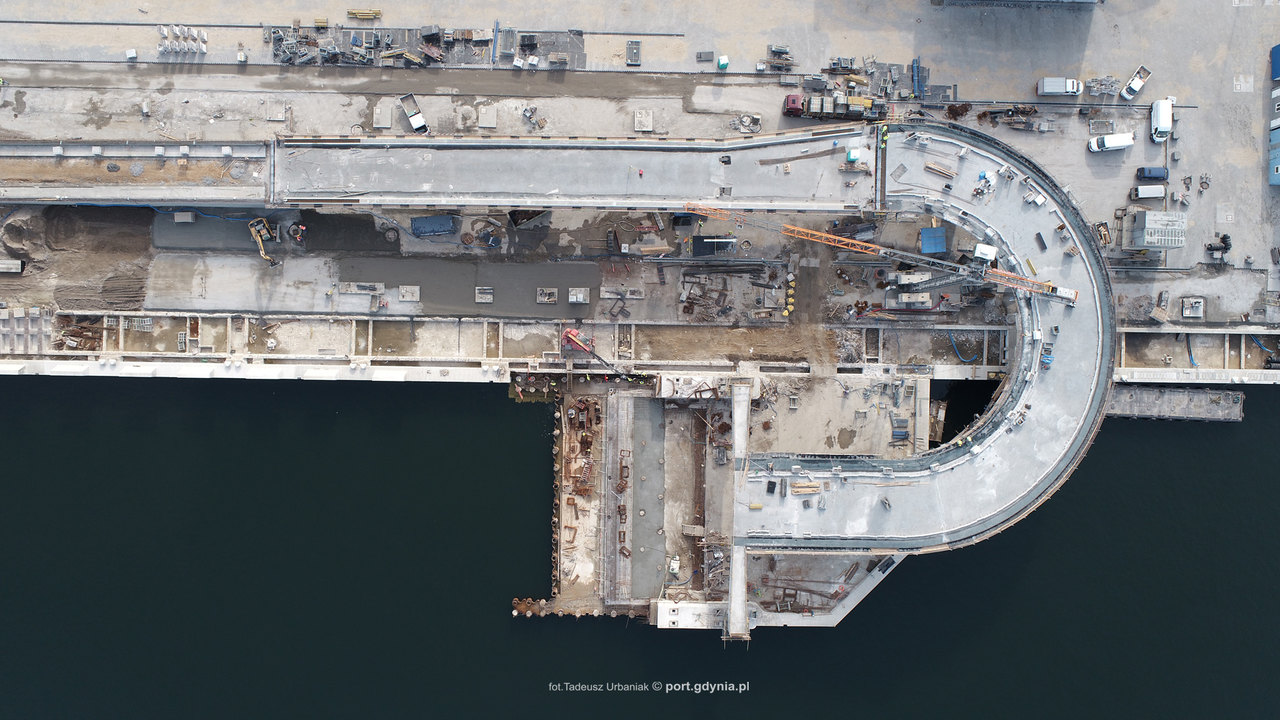 Wielkimi krokami zbliża się zakończenie prac przy budowie Nowego Publicznego Terminalu Promowego w nowej, dogodniejszej lokalizacji. Nowy obiekt będzie mógł obsługiwać promy o długości 240 m i zapewni krótszy czas obsługi dzięki czemu port zyska nowych armatorów na rozwijającym się segmencie ro- ro. Budynek terminalu, magazyn oraz galeria pasażerska są już na ukończeniu, obecnie prowadzone są roboty wykończeniowe i instalacyjne wewnątrz. Zakończono roboty konstrukcyjne związane z przebudową Nabrzeża Polskiego oraz rampy Ro-Ro, do wykonania pozostał montaż wyposażenia – urządzenia odbojowe, cumownicze itp. Konstrukcja estakady najazdowej wraz z nawierzchniami bitumicznymi jest ukończona, prowadzony jest obecnie montaż wyposażenia, wykonywane są nawierzchnie betonowe. Roboty kolejowe zostały całkowicie ukończone, zaś nawierzchnie drogowe placów i parkingów wykonano w ok. 90%.123.jpg)