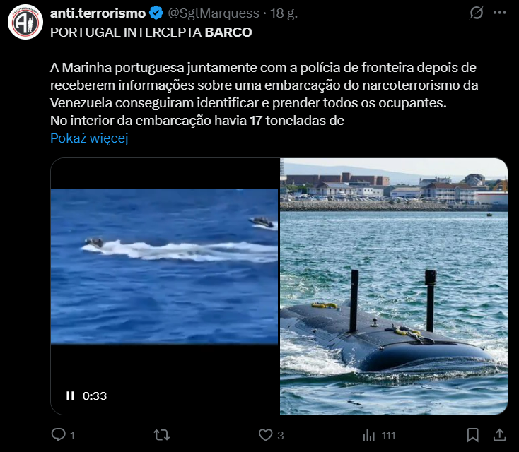 Rzecznik poinformował, że zatrzymana jednostka jest drugą półzanurzalną łodzią przemytników narkotyków, którą służby bezpieczeństwa Portugalii przejęły w tym roku na morzu. W marcu na podobnej łodzi zarekwirowano ponad 6 ton kokainy.