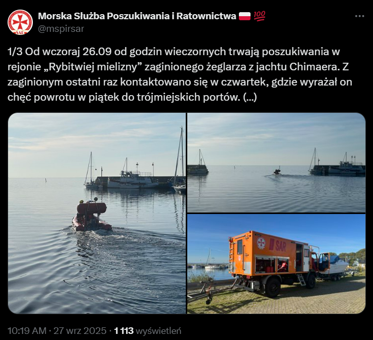 Od piątku 26.09 od godzin wieczornych trwają poszukiwania w rejonie „Rybitwiej mielizny” zaginionego żeglarza z jachtu Chimaera. Z zaginionym ostatni raz kontaktowano się w czwartek, gdzie wyrażał on chęć powrotu w piątek do trójmiejskich portów.