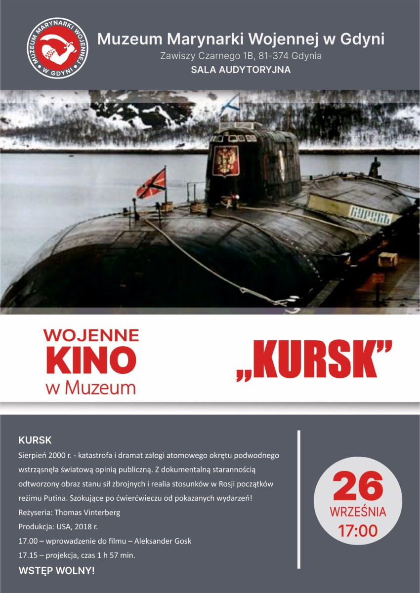 Po wakacyjnej przerwie Muzeum Marynarki Wojennej wraca do cyklu „Wojenne Kino w Muzeum”. Jako pierwszy wyświetlony zostanie film: „KURSK”.