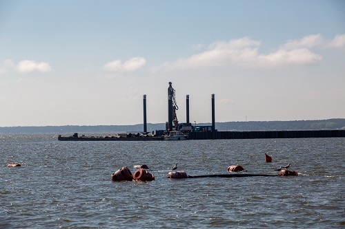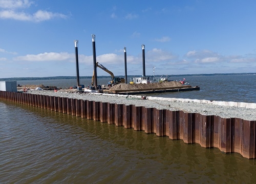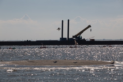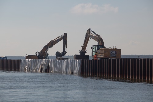 Właśnie odbywają się też prace związane z wydobyciem namułu z wnętrza grodzy i prace nurkowe związane z montażem podwodnym ściągów. Trwa zasyp piaszczysty ringu wyspy.
