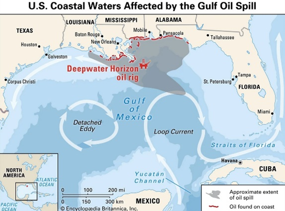 Wyciek ropy z odwiertu Deepwater Horizon, żródło: Britannika, 2025