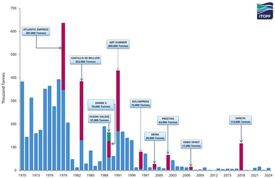 Całkowita objętość ropy, która trafiła do środowiska morskiego z powodu wycieków ze zbiornikowców ropy w 2024 r. wyniosła około 10 tys. ton. W ciągu ostatniego półwiecza statystyki dotyczące częstotliwości wycieków większych niż 7 ton z tankowców wykazały wyraźną tendencję spadkową. Wycieki przekraczające 7 ton zmniejszyły się o ponad 90% od lat 70. XX wieku. Analitycy ITOPF zastrzegają, że „chociaż zwiększony ruch zbiornikowców może oznaczać zwiększone ryzyko, pocieszające jest to, że tendencja spadkowa w zakresie wycieków ropy utrzymuje się pomimo ogólnego wzrostu handlu ropą w tym okresie”.