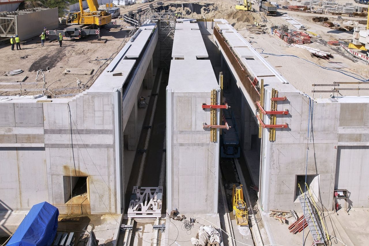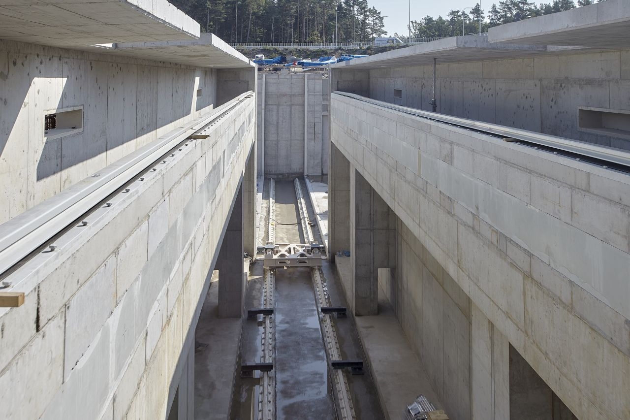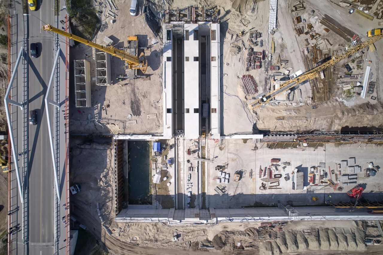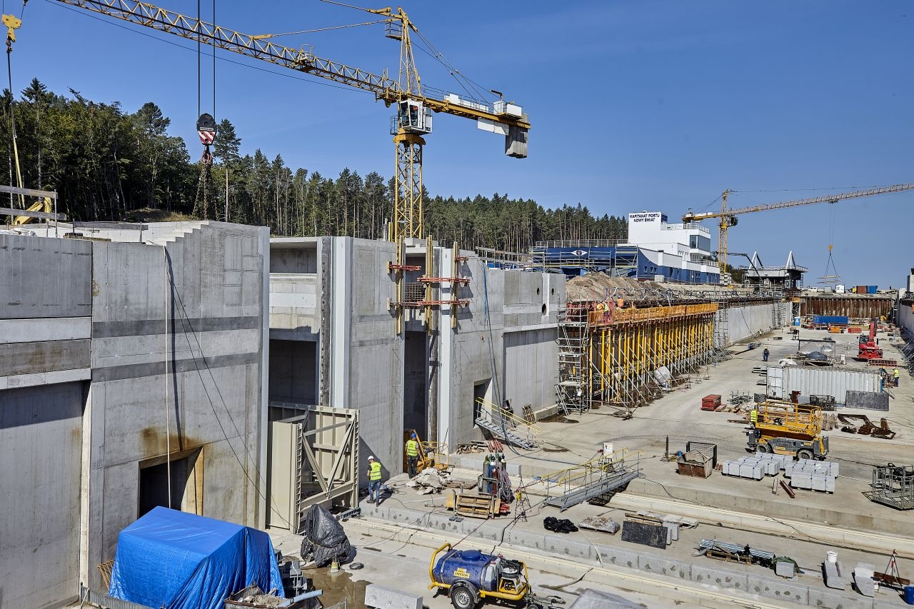 – Jesteśmy w końcowej fazie realizacji kieszeni południowej. Za chwilę ukończymy kanał obiegowy. Z końcówką września rozpoczniemy budowę ostatniego elementu kieszeni południowej – budynku napędowni, obiektu w którym będzie znajdywała się cala hydraulika i automatyka odpowiedzialna za ruch obu bram – powiedział Mariusz Janczewski, zastępca dyrektora projektu – konsorcjum NDI/Besix. – Mocno zaawansowane są też prace żelbetowe związane z realizacją ścian obudowy głównej śluzy. Rozpoczęliśmy również realizację oczepu, czyli finalnego elementu wykończeniowego całej konstrukcji bramy, na którym zostanie zamontowane wyposażenie hydrotechniczne.