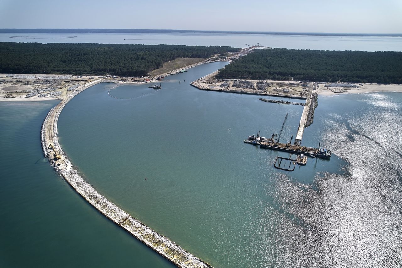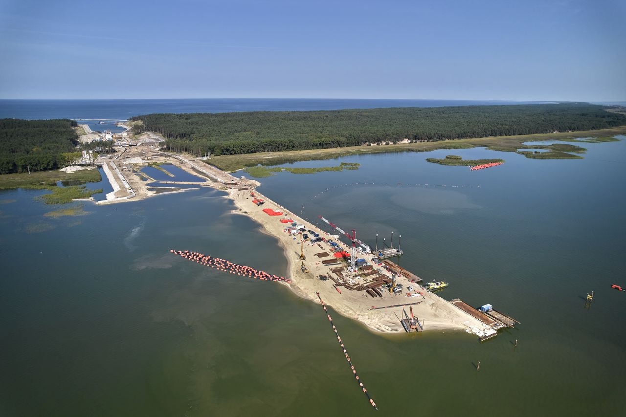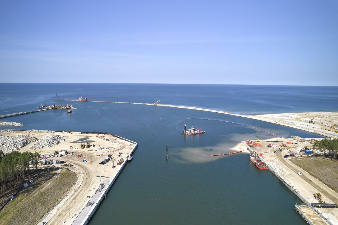 Intensywne prace są również prowadzone w rejonie Zatoki Gdańskiej. Zakończono już wbijanie stalowych ścianek szczelnych w części zasadniczej falochronu wschodniego. Obecnie są zakładane ściągi. Wykonywany jest też narzut kamienny i odbywa się układanie bloków betonowych x-block plus. Wykonywane jest podłoże i warstwa wyrównawcza z betonu oraz nadbudowa na falochronie zachodnim. Rozpoczęto produkcję i dostawy elementów x-block plus na głowice falochronów.