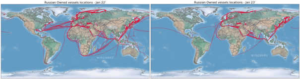 Figures 3 & 4: Russia owned/affiliated vessels in January 2022 vs. January 2023