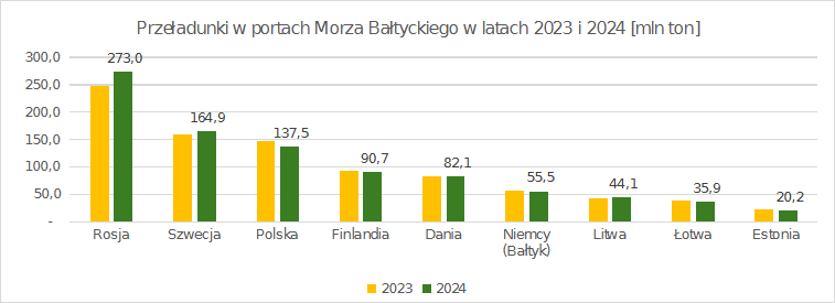 Wstępne szacunki wskazują na łączny wolumen towarów wynoszący 903,9 mln ton w 2024 roku, co oznacza 1,5% przyrost w stosunku do roku ubiegłego. Liderem pod względem obsłużonej masy ładunkowej (273 mln ton), jak i ubiegłorocznych zmian (+10%) są porty rosyjskie. Wskazane wyniki to dodatkowe 25 mln ton ładunków. Pozytywne zmiany obserwowano także portach szwedzkich (+3%), które z wynikiem 165 mln ton znajdują się na drugiej pozycji w regionie. Wśród zyskujących wolumeny znalazły się również porty litewskie (+6%), których łączne przeładunki wyniosły 44 mln ton.