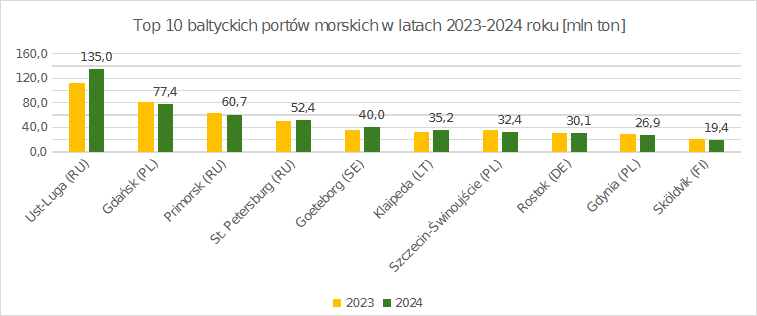 Największym portem na Bałtyku pozostaje rosyjska Ust-Luga, która w ubiegłym roku przeładowała 135 mln ton. Wynik ten oznacza olbrzymi przyrost masy ładunkowej wynoszący blisko 23 mln ton (+20%) w stosunku do roku ubiegłego. Drugim portem Bałtyku pozostaje Gdańsk, który jednak tracił w ostatnim roku. Przeładunki na poziomie 77 mln ton to spadek o ponad 4%. Podobne ograniczenie (-4%) zanotował kolejny na liście, port w Primorsku. Następna trójka wśród wiodących portów bałtyckich, czyli St. Petersburg, Goeteborg oraz Kłajpeda zwiększyła obsłużony wolumen ładunków. Było to odpowiednio niecałe +3 mln ton w Petersburgu i Kłajpedzie oraz +4 mln ton w Goeteborgu. Wśród największych portów Morza Bałtyckiego znajdują się dwa kolejne polskie porty, Szczecin i Świnoujście z wynikiem 32 mln ton (-8%) oraz Gdynia z wolumenem 27 mln ton (-9%).