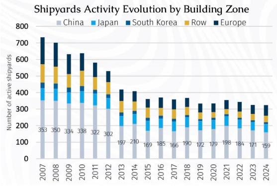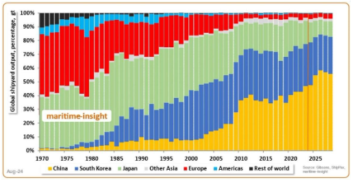 Do 2027 r. Chiny zamierzają zwiększyć potencjał produkcyjny przemysłu okrętowego o 80%. Ich potencjał produkcyjny kilkakrotnie przekroczy możliwości stoczni UE. Z kontraktami na ponad 3200 statków chińskie stocznie mają 56% udziału w globalnym portfelu zamówień według tonażu CGT. Od dekady stoczniowcy z Chin wchodzą w nowe, najbardziej zaawansowane technologicznie projekty. W 2024 r. chiński portfel zamówień na budowę statków osiągnął rekordowe wielkości i nic nie wskazuje na to, że miałoby się to zmienić. Europa jest trzecia, z 11% udziałem w rynku.