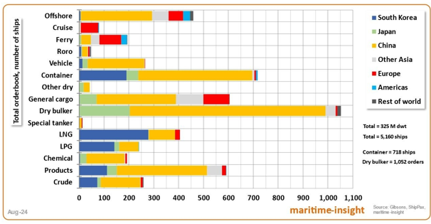 Południowokoreańskie stocznie nadal dominują w segmencie gazowców. Ale ich pozycja wyraźnie słabnie. Chińskie stocznie mają obecnie 32% udział w portfelu zamówień na gazowce, w porównaniu z 14% udziałem w rynku pod koniec października 2020 r. i zaledwie 1% w 2008 r. W pierwszym tygodniu października 2024 r. do chińskich stoczni trafiły kontrakty na nie mniej niż 12 gazowców LNG, cztery 96-metrowe statki do obsługi offshore i do sześciu chemikaliowców.