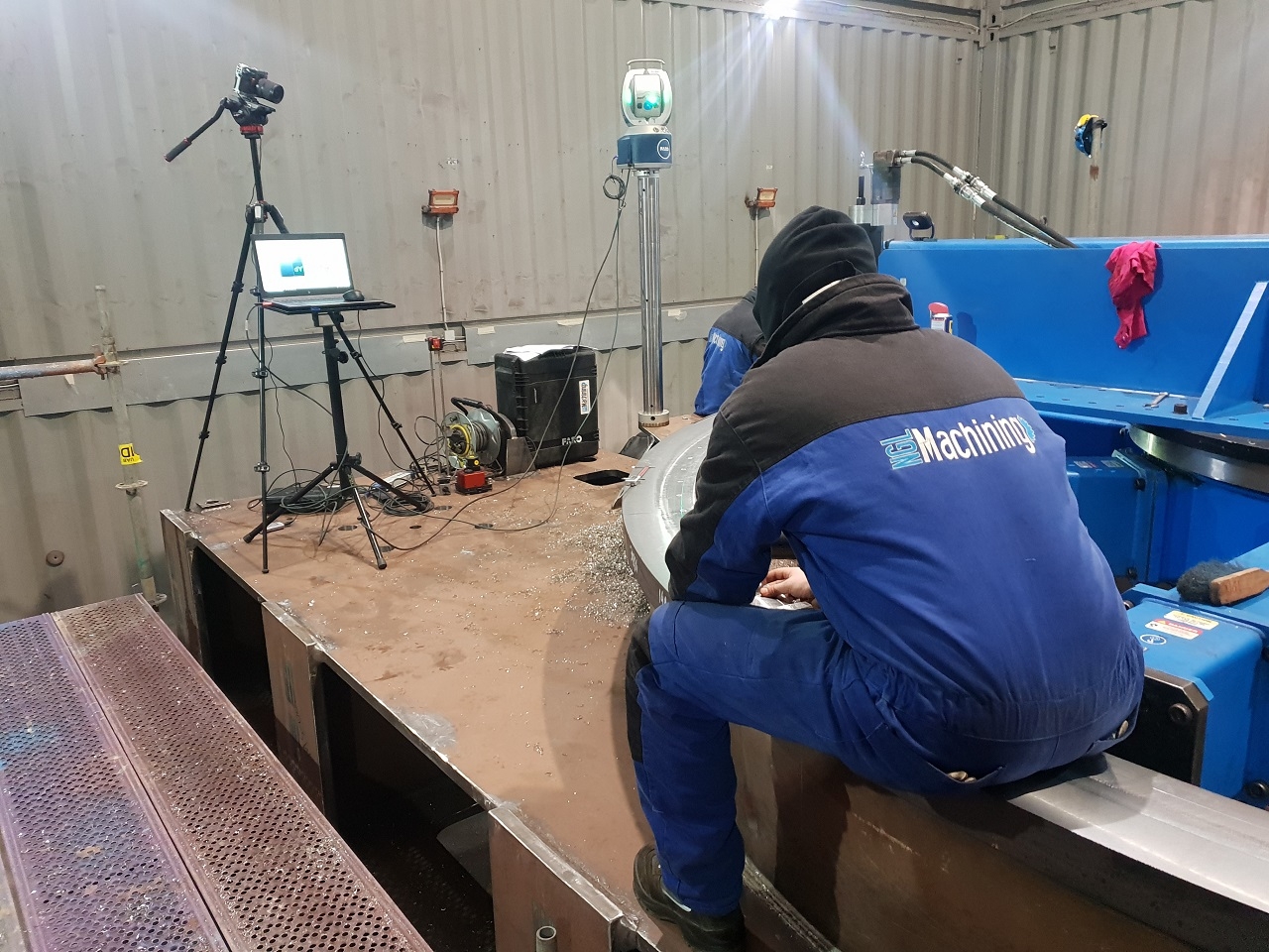 Oczekiwana precyzja wymusza na firmach wykonawczych posiadanie coraz bardziej dokładnych urządzeń pomiarowych, dzięki którym nie tylko jest się w stanie ustawić maszynę, ale i na bieżąco śledzić proces realizowanej obróbki. Prezentowane na filmie (zobacz wyżej), obróbka fundamentu (Ø5000 mm) pod platformę obrotową jest najlepszym tego przykładem. Wykorzystując system laserowy FARO (laser tracker Ventage E), operatorzy byli w stanie idealnie (z dokładnością do 0,10 mm) wpasować przenośną frezarkę Climax CM6200 w oś konstrukcji, na bieżąco kontrolować poprawność realizowanej obróbki jak i precyzyjnie natrasować położenie otworów montażowych.