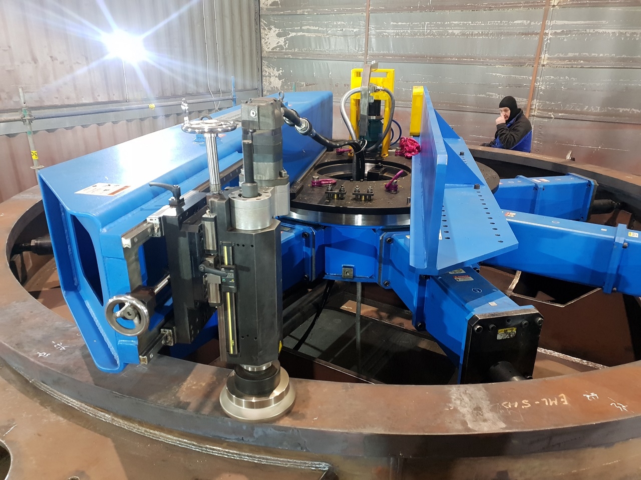 Maszyny, w wersji podstawowej, pozwalająca na obróbkę kołnierzy o średnicy do Ø5500 mm. Frezarka trafiła na projekt prosto z fabryki, bez możliwości jej wcześniejszego sprawdzenia. Pomimo wielu niewiadomych, obróbkę udał się wykonać zgodnie z dokumentacją w deklarowanym terminie. Zaprocentowało doświadczenie zespołu wykonawczego. Operatorzy bez większych problemów wdrożyli się w maszynę, a sam proces obróbki realizowali w oparciu o ogólnie przyjęte zasady, które od lat się nie zmieniają.