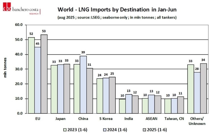 Import LNG do Unii Europejskiej wzrósł o 18,5% w pierwszej połowie 2025 r. W tym samym okresie chińskie porty przepompowały w imporcie o ponad 20% mniej LNG niż w pierwszej połowie 2024 r. Mimo spadku popytu na LNG w Chinach w pierwszej połowie 2025 r. zaobserwowaliśmy odbicie, a globalny eksport wzrósł o 3% r/r do 210,5 mln ton – podaje Banchero Costa na bazie danych LSEG.