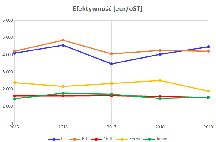 Tabela zawiera wyliczenia z lat 2015 – 2019 efektywności Euro/cGT dla statków produkowanych jako gotowe jednostki pływające zbudowane w Polsce i porównuje ze średnią efektywnością Euro/cGT uzyskiwaną przez stocznie europejskie, chińskie, japońskie i południowo koreańskie.