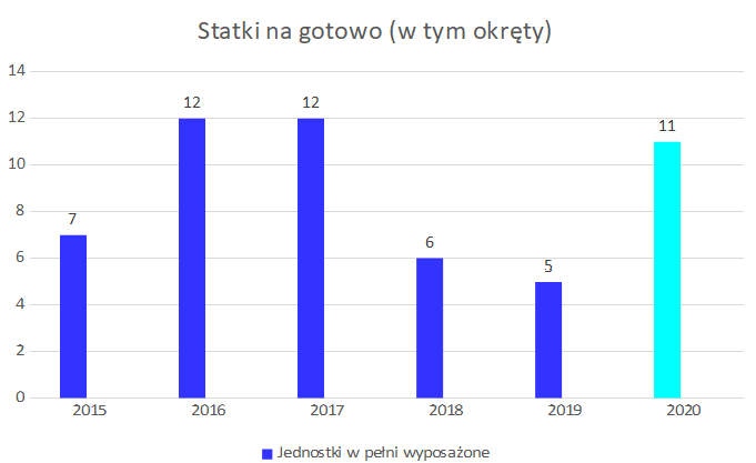 Liczba gotowych statków i okrętów łącznie zbudowanych w ostatnich latach na gotowo przez przemysł stoczniowy w Polsce zaprezentowana jest na wykresie.