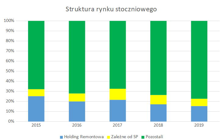 - Holding Remontowa (grupa prywatna) – wielkość udziału tej grupy w łącznej wartości przychodów przemysłu stoczniowego w Polsce waha się w różnych okresach wokół ok. 20%,