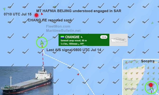 Chiński statek handlowy „Chang He” pod banderą Sierra Leone na przełomie 14 i 15 lipca br. zatonął w pobliżu wybrzeża somalijskiego. 14 lipca o godzinie 20.31 czasu lokalnego Nairobi Rescue Coordination Centre (NRCC) otrzymało wiadomość od Maritime Rescue and Coordination Centre (MRCC) z Grecji na temat tonięcia jednostki „Change He” na pozycji 06 50 N / 052 38 E z 12 osobami na pokładzie, które wymagają natychmiastowej asysty.