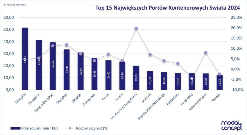Dane dotyczące największych 15 portów kontenerowych świata wskazują, że realizują one blisko 42% globalnych przeładunków, co przekłada się na ponad 370 mln TEU w 2024 roku. Co więcej, ponad 1/3 tego wolumenu to tylko trzy największe porty. Pozycję lidera zajmuje Szanghaj, który osiągnął rekordowy wynik przebijając z nawiązką barierę pięćdziesięciu milionów TEU (51,51 mln TEU; +4,8%). Drugi na liście port w Singapurze może również się pochwalić złamaniem kolejnej, symbolicznej granicy oraz najwyższym w historii wynikiem wynoszącym 41,12 mln TEU. Trzecią pozycję z niewielką stratą zajmuje chiński Ningbo-Zhoushan, w którym obroty zwiększyły się o przeszło 11% w odniesieniu do ubiegłego roku osiągając ostatecznie 39,30 mln TEU. Na następnych pozycjach znalazły się kolejne trzy chińskie porty, z których najwyższą dynamikę wzrostu odnotował Shenzhen (+11,8%).