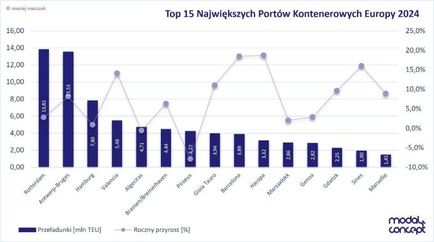 Pomimo relatywnie słabej reprezentacji Europy w zestawieniu światowych liderów warto zaznaczyć, że pierwsza piętnastka starego kontynentu rosła w tempie wyższym (+5,9%) niż globalni liderzy, co po części było wynikiem słabego roku 2023 (-5,3%). Łączne obroty top 15 wyniosły 76,22 mln TEU w 2024 roku, co stanowi około 70% całkowitych przeładunków kontenerowych w Europie. Zaraz za parą rynkowych liderów uplasował się port w Hamburgu, który w ubiegłym roku zwiększył swoje przeładunki kontenerowe o 1% uzyskując 7,8 mln TEU. Warto zwrócić uwagę na wysoką dynamikę w portach Morza Śródziemnego, gdzie największe zmiany zanotowano w hiszpańskich Barcelonie (+18,5%) oraz Walencji (+14,1%). Szybko rosły także inne porty południa, włoski Gioia Tauro (+11,0%), portugalski Sines (+16,0%), czy francuska Marsylia (+8,9%). Co ciekawe, również tam zanotowano jedyne spadki w zestawieniu. Port w Pireusie stracił prawie 8% swoich obrotów, a Algeciras niecały jeden procent.