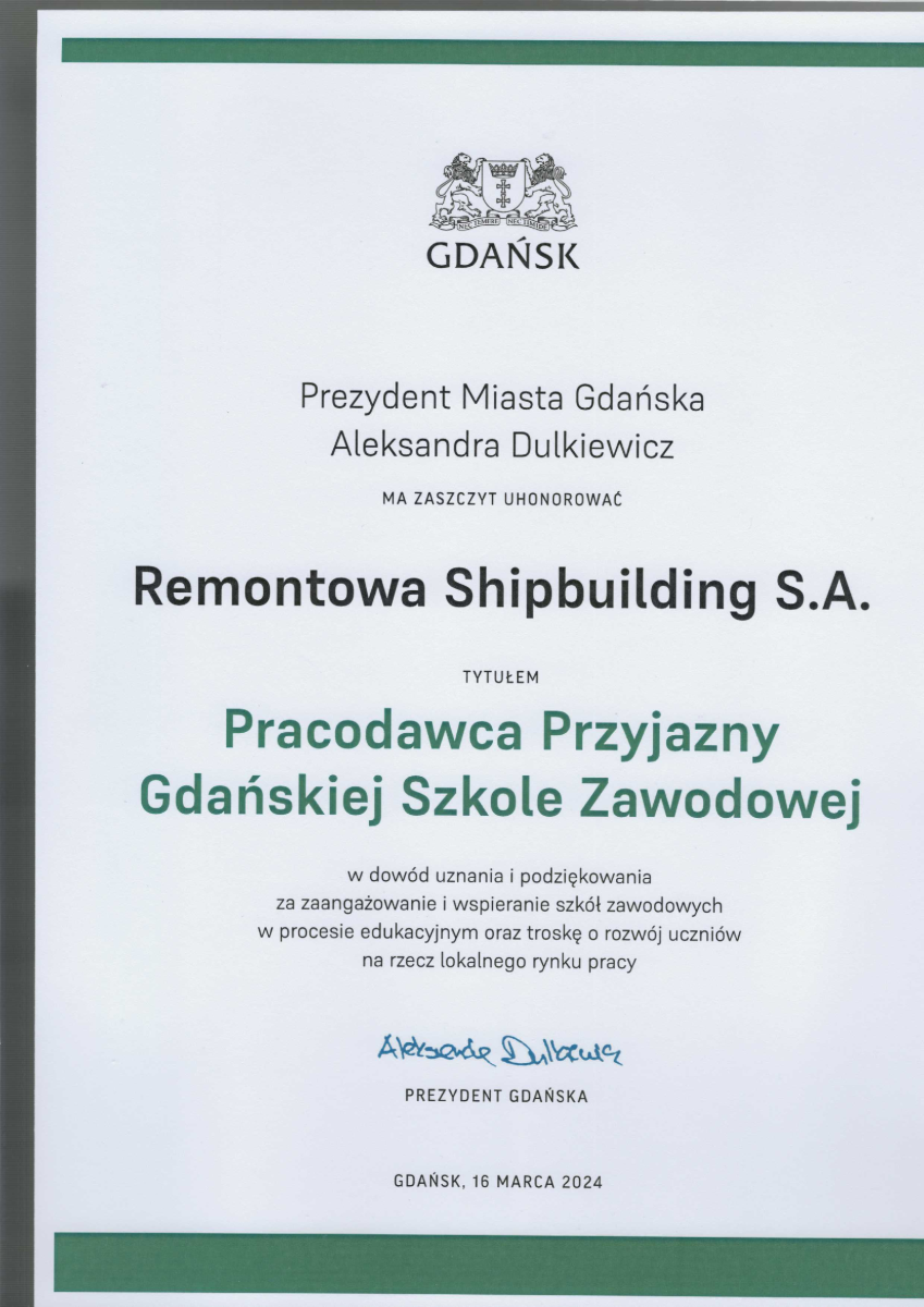 W Centrum Wystawienniczo-Kongresowym AmberExpo 16 marca odbyły się Gdańskie Targi Szkół Ponadpodstawowych. Ważnym punktem wydarzenia była gala konkursu „Pracodawca Przyjazny Gdańskiej Szkole Zawodowej”, w trakcie której wręczono nagrody Prezydenta Miasta Gdańska pracodawcom najbardziej zaangażowanym we współpracę ze szkołami branżowymi i technikami. Wśród wyróżnionych znalazła się gdańska stocznia od wielu lat współpracująca ze Szkołami Okrętowymi i Technicznymi Conradinum.