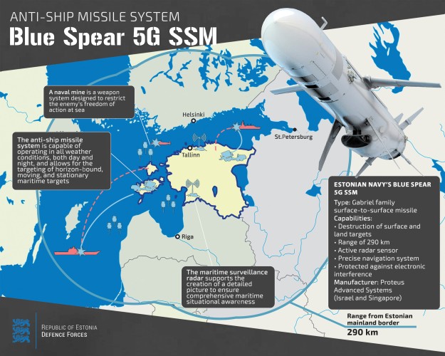 "Blue Spear 5G SSM to najbardziej zaawansowany i innowacyjny system uzbrojenia estońskich sił obronnych, zdolny do działania w każdych warunkach pogodowych w dzień i w nocy, umożliwiający atak poza linią horyzontu oraz przeciwko ruchomym i stacjonarnym celom na morzu. Maksymalny zasięg rakiety wynosi 290 kilometrów" - zaznaczyła agencja BNS.