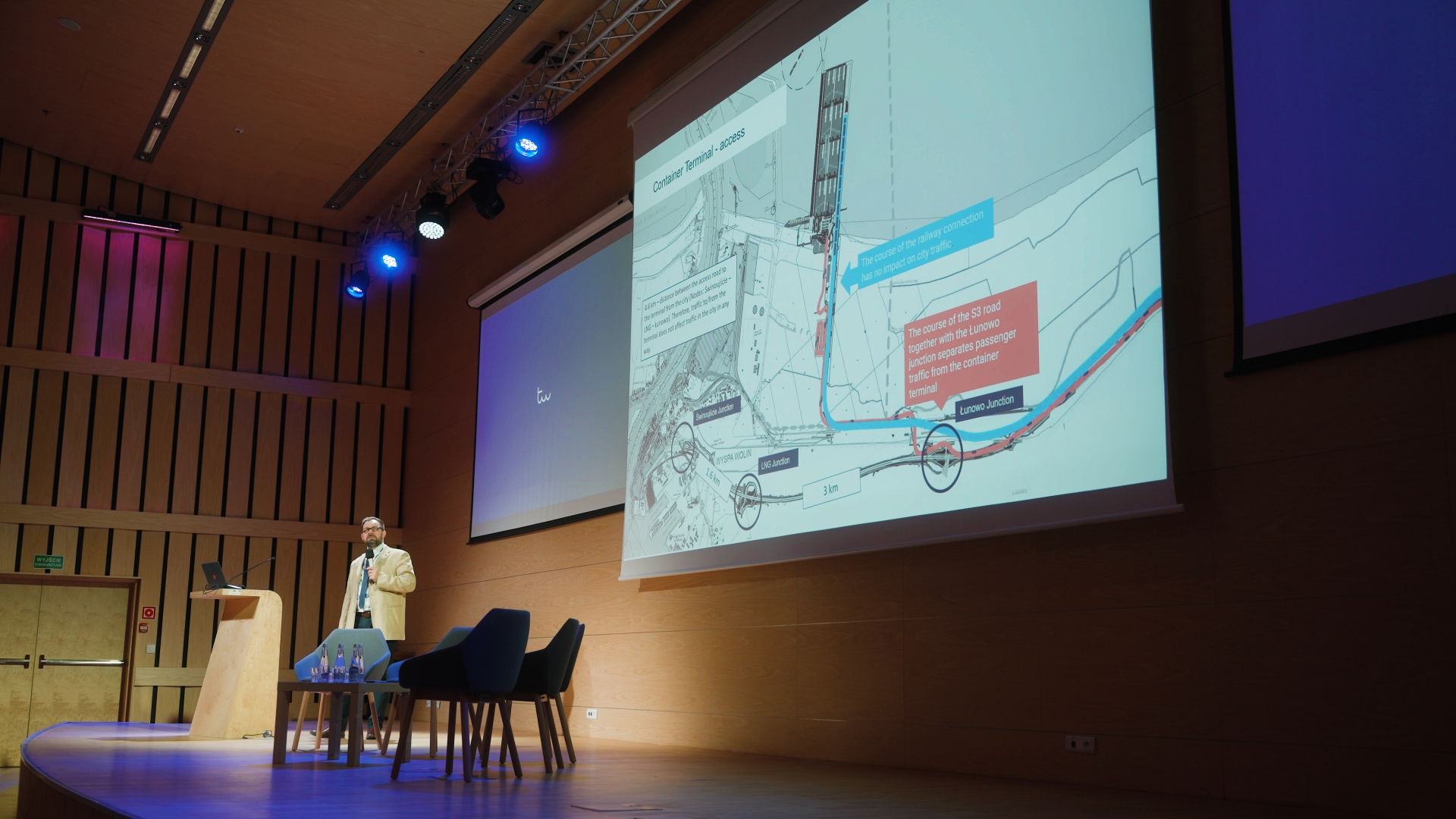 Maksymilian Czapiewski, menedżer klienta w Zarządzie Morskiego Portu Gdańsk przedstawił strategię inwestycyjną Portu Gdańsk, w tym budowę terminalu FRSU, systemu zasilania brzegowego oraz rozbudowę połączeń z Naftoportem.