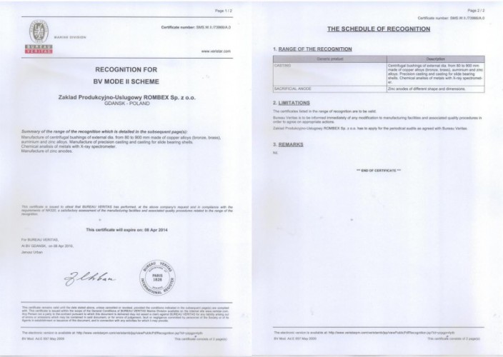 Posiadamy certyfikat uznania BUREAU VERITAS obejmujący: produkcję tulei odśrodkowych o średnicach zewnętrznych od 80 do 900mm, odlewanie anod cynkowych, produkcję odlewów precyzyjnych, wylewanie stopem łożyskowym oraz przeprowadzanie analiz składu chemicznego za pomocą spektrometru rentgenowskiego NITON XLt.