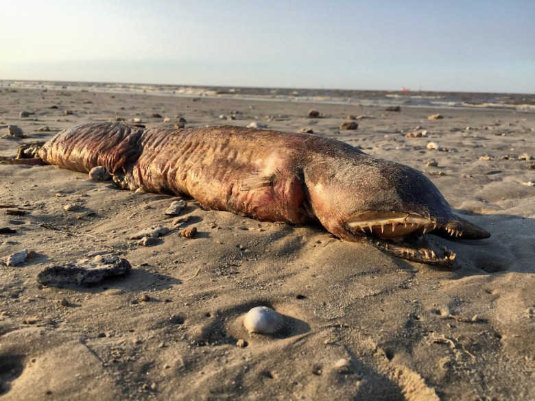 Martwego stwora o długości około 1,5 metra odkrył w ostatni czwartek Justin Hill. Jak stwierdził na swoim profilu w jednym z portali społecznościowych, „bestia” mogła być rekinem, choć nie jest to takie oczywiste. Internauci mieli różne pomysły na temat pochodzenia istoty, większość jednak była zdania, że mamy do czynienia z poranionym rekinem lub foką.