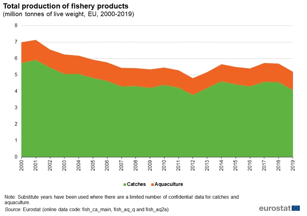 Spożycie ryb przez mieszkańca UE oszacowano na 23,97 kg. Głównie były to produkty z połowów. W 2019 r. zanotowano niewielki spadek w porównaniu z 2018 r., bowiem obywatele UE spożyli średnio o 390 gramów mniej produktów rybołówstwa i akwakultury.