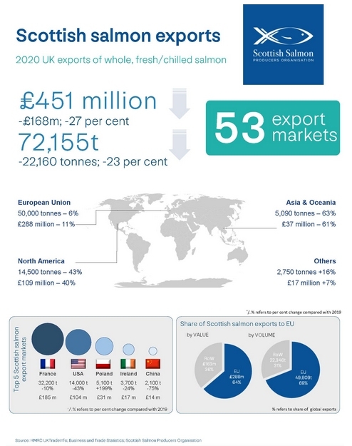 Nowy raport szkockiej organizacji Salmon Scotland podał, że w 2021 r. sprzedaż łososia szkockiego wyniosła 97 835 ton i był to wzrost o 36% rok do roku. Z krajów europejskich największe ożywienie objęło Francję. Pozostałymi głównymi odbiorcami łososia szkockiego jest USA, a także nastąpił duży wzrost popytu w Chinach i Singapurze.