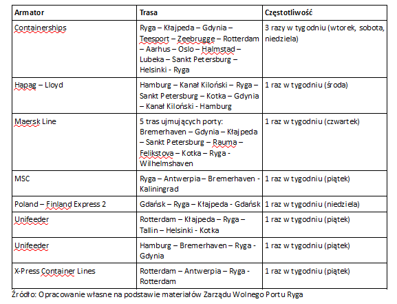 Port Ryga jest przede wszystkim typowym portem lokalnym, ważnym z punktu widzenia żeglugi europejskiej. Regularne połączenia obejmują tutaj bowiem przede wszystkim linie feederowe (połączenia dowozowe kontenerów) a także promowe.