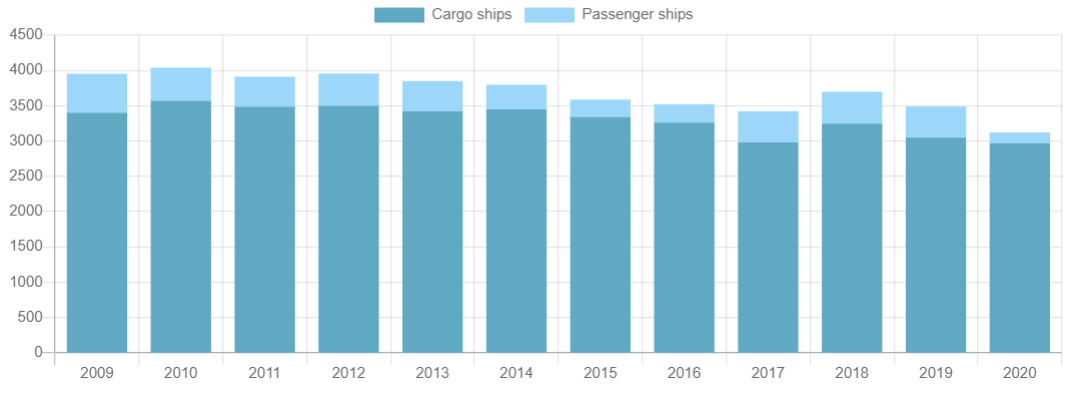 Ilość zawinięć statków towarowych i pasażerskich w porcie Ryga na przestrzeni lat 2009 – 2020.