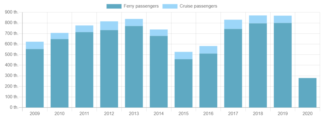 Roczna ilość obsługiwanych pasażerów wycieczkowców oraz promów w latach 2009 – 2020.