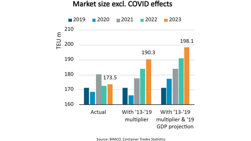 Przy założeniu, że światowa gospodarka będzie rozwijała się zgodnie z wcześniejszymi przewidywaniami, zaś mnożnik PKB odpowiadał poziomowi z lat 2013-2019, globalny rynek kontenerowy w ubiegłym roku byłby większy o 24,6 mln TEU.