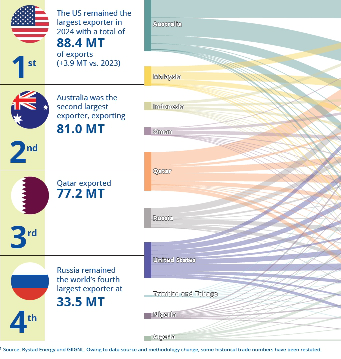 Na kolejnych miejscach znalazły się Australia i Katar ze zdolnością odpowiednio 87,6 MTPA i 77,1 MTPA. Tylko te trzy rynki odpowiadają za ponad połowę globalnej zdolności produkcyjnej LNG. Pomimo wzrostu mocy produkcyjnych globalny średni wskaźnik wykorzystania instalacji nieznacznie spadł z 88,7% w 2023 r. do 86,7% w 2024 r.. Stało się tak z powodu konserwacji, przerw w dostawie prądu i serii przerw technicznych w różnych obiektach odpowiedzialnych za skraplanie gazu.