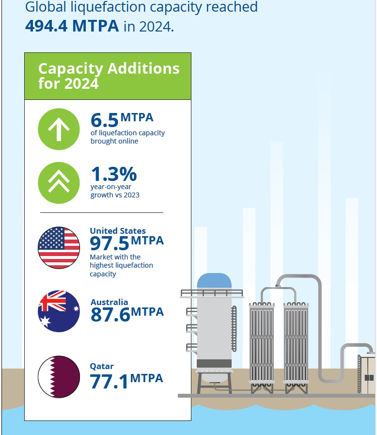 Globalny potencjał produkcyjny i skraplania LNG wzrosły o 6,5 mln ton rocznie (MTPA) w 2024 r. do wielkości 494,4 MTPA w grudniu ubiegłego roku. Wzrost ten był wywołany uruchomieniem instalacji Plaquemines LNG 1-8 (T1–T8) w Stanach Zjednoczonych (4,5 MTPA), Altamira FLNG w Meksyku (1,4 MTPA) i projektu Marine XII FLNG w Kongo (0,6 MTPA). Stany Zjednoczone utrzymały swoją pozycję wiodącego rynku pod względem operacyjnej zdolności skraplania, osiągając 97,5 MTPA.