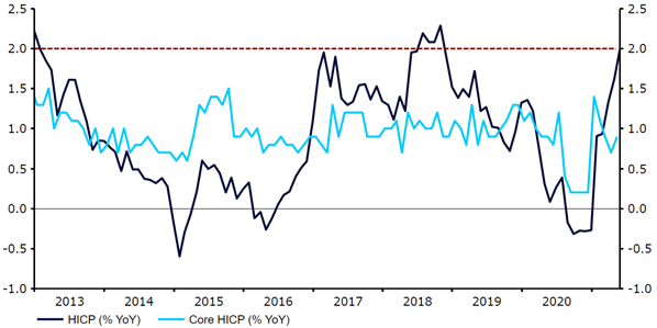 Nie spodziewamy się po tym zebraniu żadnych zmian w polityce monetarnej EBC i uważamy, że bank będzie starał się tonować wypowiedzi mimo poprawy w publikowanych danych ze strefy euro. Po rozpoczęciu znoszenia pandemicznych restrykcji wskaźniki aktywności w całej Europie w ostatnich tygodniach często zaskakiwały w górę. Indeksy PMI znowu kierują się w dobrą stronę – w maju indeks kompozytowy dla strefy euro został zrewidowany w górę do 57,1 pkt, co jest najwyższym poziomem od lutego 2018 r. W niewielkim stopniu narasta również presja inflacyjna – stopa inflacji wzrosła w zeszłym miesiącu do najwyższego od ponad dwóch i pół roku poziomu 2% (Wykres 1).
