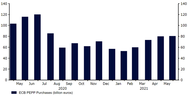 Jesteśmy zdania, że obecne tempo skupu aktywów w ramach programu PEPP (ok. 80 mld euro miesięcznie) zostanie utrzymane do września, od kiedy to spodziewamy się stopniowego zmniejszania zakupów. Rozmowy dotyczące daty zakończenia programu prawdopodobnie również będą musiały zaczekać przynajmniej do wrześniowego posiedzenia. Decydenci będą mieli wówczas znacznie jaśniejszy obraz stanu kryzysu zdrowotnego i, w szczególności, jego długoterminowych implikacji dla inflacji w strefie euro.
